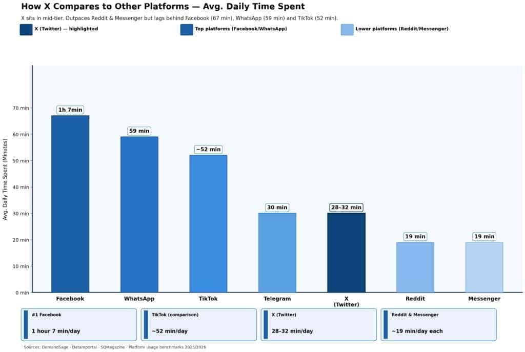 X outpaces Reddit and Messenger but lags behind WhatsApp and Facebook in total daily engagement. Compared to TikTok (approximately 52 minutes/day), X users spend considerably less time per day.