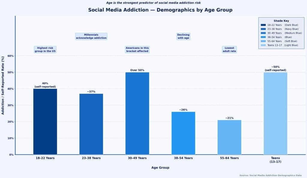 | 23–38 years | ~37% | Millennials acknowledge addiction |
