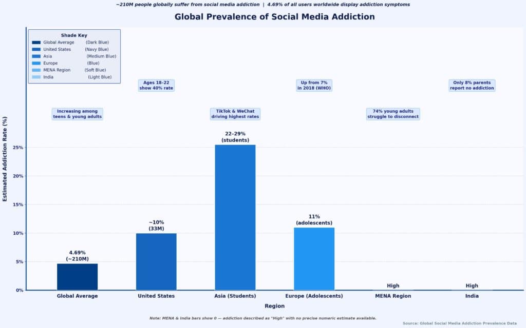 Social media addiction is pervasive across all regions, though rates vary significantly: