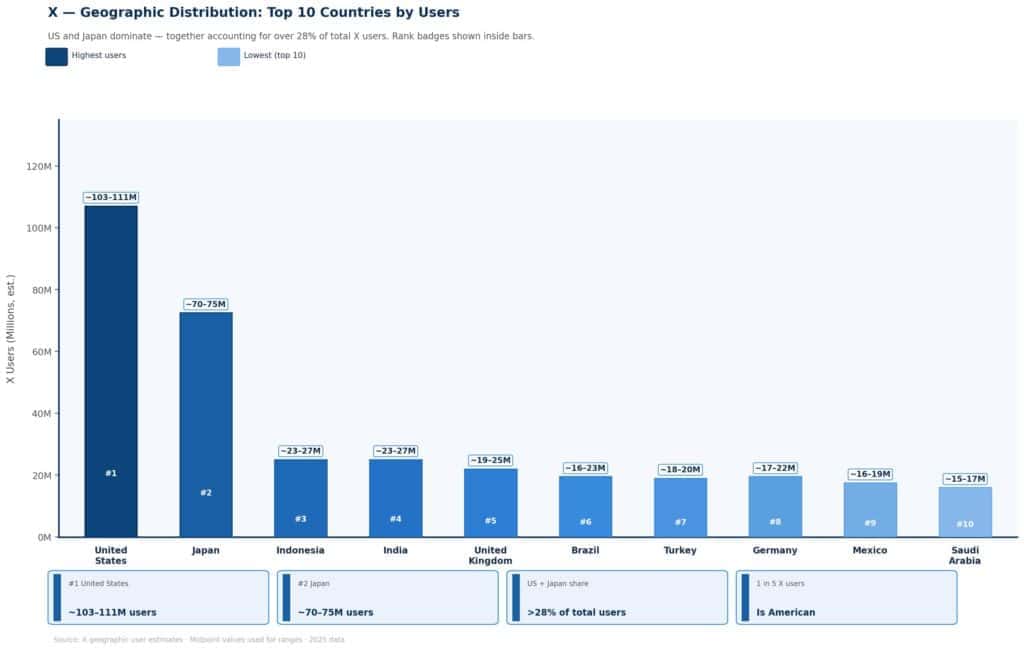 The United States and Japan dominate X’s user base, together accounting for over 28% of the platform’s total users: