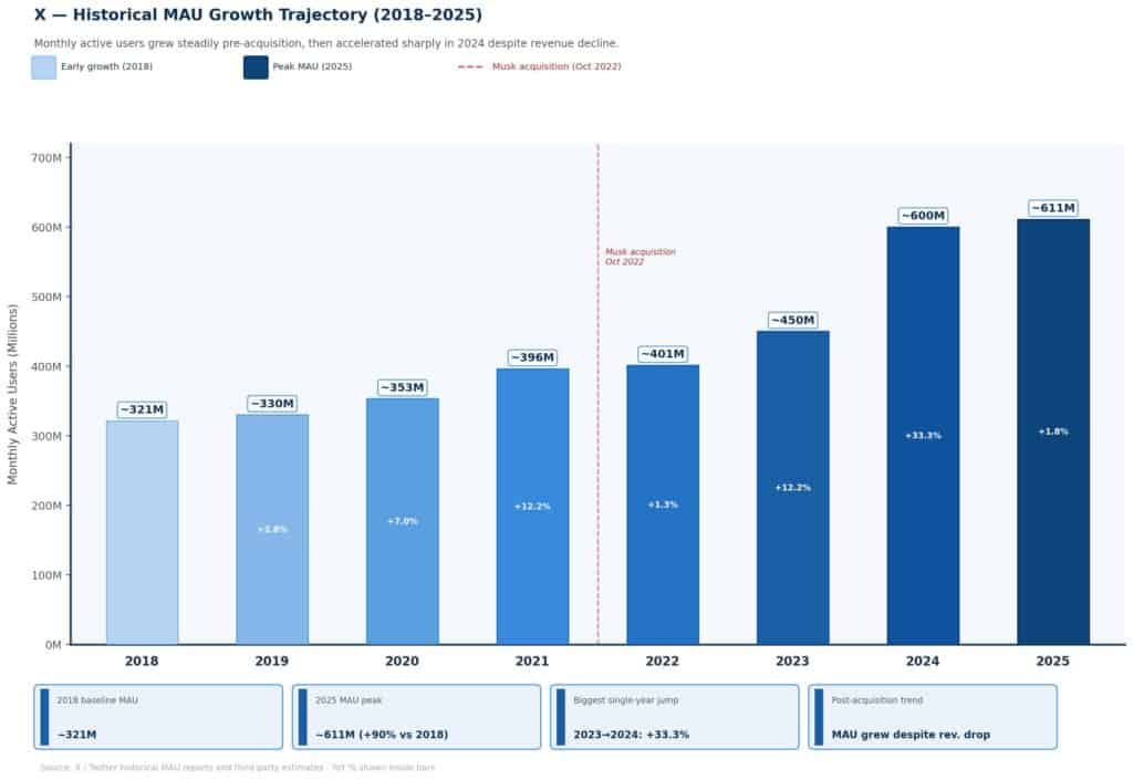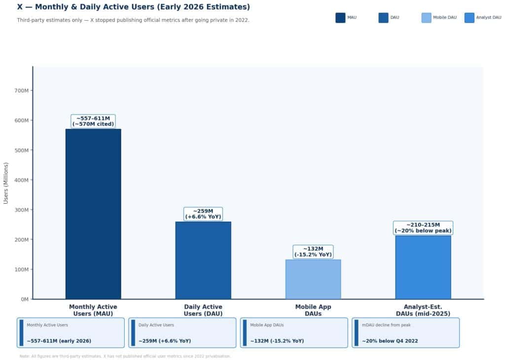 - Monthly Active Users (MAUs): Third-party estimates for early 2026 place X’s MAU base between 557 million and 611 million, with the most commonly cited figure being approximately 570 million.