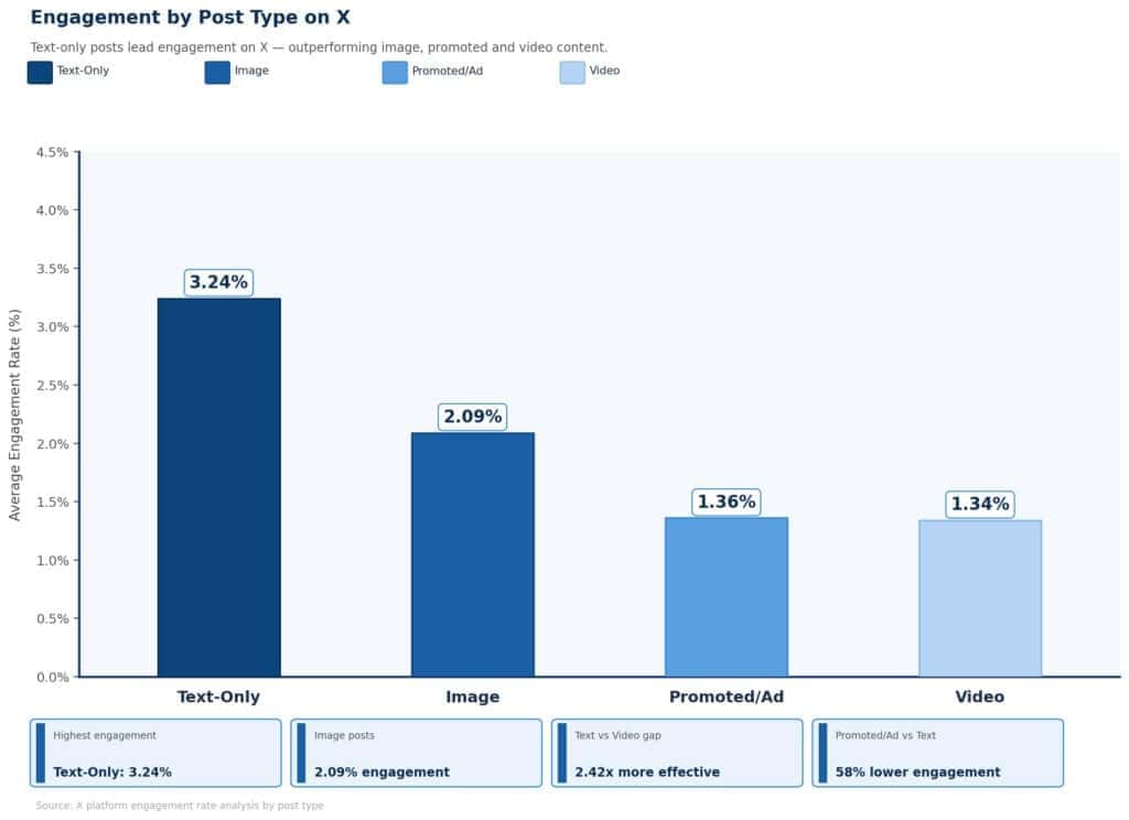 - Engagement rate trend: X’s median engagement rate climbed from ~2.0% in 2024 to ~2.8% in 2025 — a +44% relative increase (Buffer analysis of 52M+ posts)