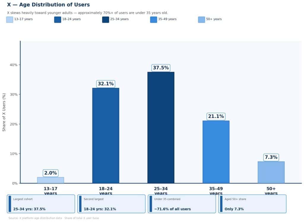 X skews heavily toward younger adults, with approximately 70%+ of users under 35 years old: