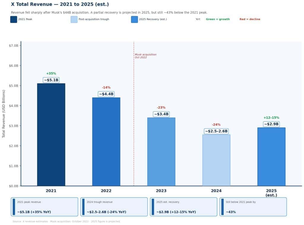 - 2025 global ad revenue: Estimated at $2.26 billion, up 16.5% from 2024 — the first growth in advertising since the Musk acquisition